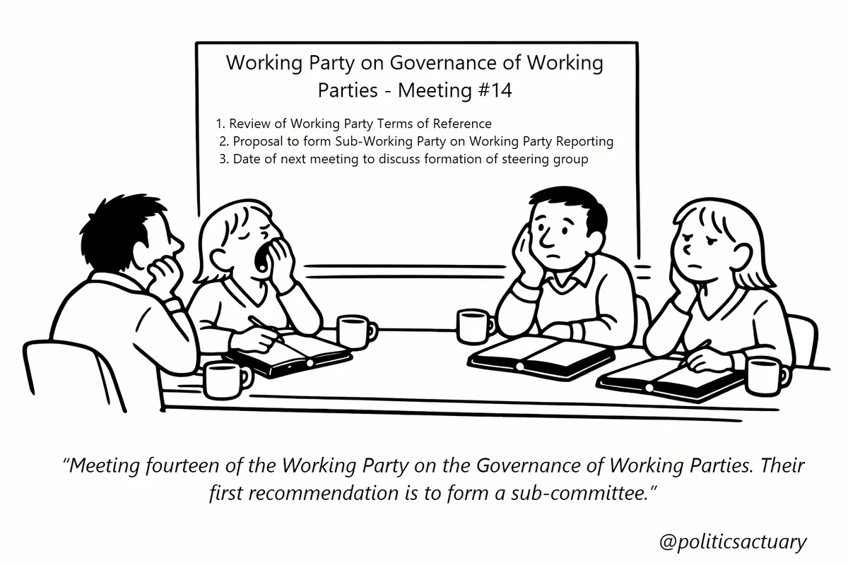 The Politics Actuary #13 — from the professional-body satire strand. Four weary volunteers sit through Meeting #14 of the Working Party on the Governance of Working Parties. Their first recommendation is to form a sub-committee.